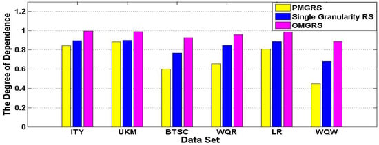 Similarly, we plot the histogram Figure 2 by experimental results about the degree of dependence in Table 3. We can obtain that the degree of dependence of three rough set models is increasing for every data set considering the order of PMGRS, Single Granularity RS, and OMGRS from Figure 2. Where the degree of dependence in PMGRS is the smallest, the degree of dependence in OMGRS is the largest and the degree of dependence in Single Granularity RS falls in between the degree of dependence in PMGRS and the degree of dependence in OMGRS, which reveal the percentage of objects that can be definitely divided into decision classes become increasing in accordance with the order of PMGRS, Single Granularity RS, and OMGRS in every data sets.