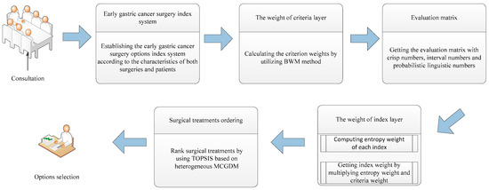 The optimum surgical treatment for early gastric cancer is usually determined by a consultative panel composed of various medical experts, so it is a group decision-making problem to find the best alternative from all of the feasible alternatives [44]. Actually, many issues cannot be evaluated explicitly in the selection process of surgical treatments for early gastric cancer, so accurate and imprecise data must be considered simultaneously. Therefore, the proposed model to select surgical treatments for early gastric cancer patients is established with heterogeneous information, which is helpful to solving the issue of asymmetric information between doctors and patients. The general progress of this model is depicted in Figure 1. The details of the proposed model will be described in the rest of this section.