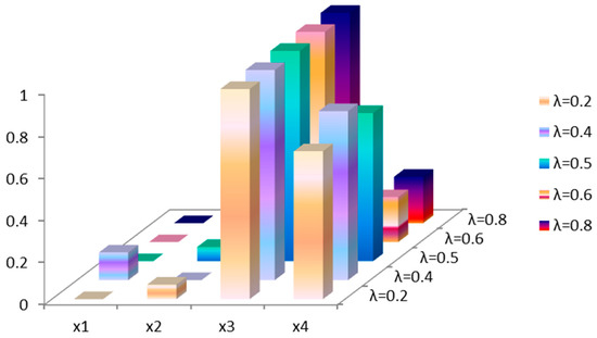 According to Table 13 and Figure 2, it is obvious that the ranking orders computed by different values of from 0 to 1 are the same as in the above experimental example. This means that the ranking results are not sensitive to the values of parameter . That is to say, despite the selection process involving various values of the compromise coefficient , the final ranking results are consistent.