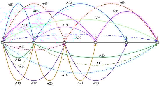 Figure 1 presents a simple railway network. The network contains six stations, named A~F, along the railway line. We generate a potential train operation plan according to the shipment characteristics on the railway network, which includes 12 trains that are denoted by the lines with different styles and colors (see Figure 1). Different line styles represent different levels of speed, i.e., a solid line represents 80 km/h, a dashed line represents 120 km/h, and a dot-and-dash line represents 160 km/h. In this way, a service network is constructed, which includes twenty-one service arcs. Note that all the arcs differ from each other even they belong to the same train. For example, though the service arc A01 and service arc A02 belong to the same train, they are regarded as different service arcs. Moreover, even the origin station and destination station of two arcs are the same, they may be different arcs, such as arc A01 and arc A08. In order to express the service network conveniently, we convert the trains into a matrix. In this way, each train can be described by the service network (see Table 1). Meanwhile, all of the service arcs can be identified from the matrix.