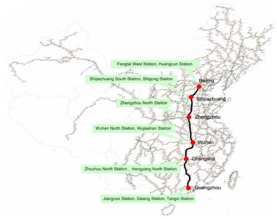 Here, we make a numerical example analysis based on the railway corridor called “Beijing–Guangzhou Railway Line” (see Figure 2), which is one of the most important north–south rail lines in China. The route, from Beijing to Guangzhou, has a total length of 2324 km. It connects six provincial capitals or municipalities and many large- and medium-sized cities, and it is one of the busiest major railways in China. The goods transported to the south on the Beijing–Guangzhou railway mainly include coal, steel, petroleum, timber and export materials. Relatively speaking, the proportion of high value-added goods to the north is higher than to the south. Therefore, this paper uses the northward direction of the Beijing–Guangzhou railway as an example for analysis. This route passes through many important railway hubs, including Guangzhou railway hub (H1), Changsha railway hub (H2), Wuhan railway hub (H3), Zhengzhou railway hub (H4), Shijiazhuang railway hub (H5), and Beijing railway hub (H6).