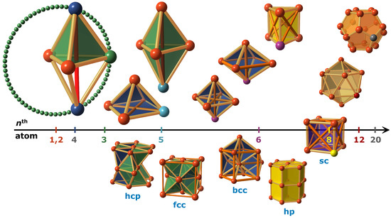 In summary, this consideration is governed by the principle of a maximum number of equilibrium distances. This intrinsically delivers a high degree of packing density. Due to the restricted nature of three-dimensional space, the geometrical atomic arrangements in the crystal growth process are limited. The principle leads to the smallest configurations or structural units for a few atoms that continue in the crystal up to the macroscopic scale and describes very well the crystal structures formed by elements. From the combination of tetrahedral and octahedral configuration, a dense crystal lattice of hexagonal close-packed symmetry (hcp) with stacking sequence ABAB or of face-centered cubic symmetry (fcc) with stacking sequence ABCABC is formed. The ground state symmetry and according natural stacking sequence may already result from the structural decision of the fifth atom towards the hexagonal anisotropy given by the defined direction of the double-tetrahedron axis or the octahedral domination and respective cubic symmetry. Tetrahedral units can be dismissed at the cost of octahedral distortions to form the macroscopic crystal solely of octahedra as is evident in the body-centered cubic lattice (bcc). Although surface energy has been neglected in the picture so far, qualitatively the structural freedom of smooth nucleus surfaces is expected to favor certain crystal symmetries but will play a decreasing and rapidly vanishing role for growing crystallites. An early phase transformation to the configuration of the cube or the prism leads to the simple cubic lattice (sc) and the simple hexagonal lattice (hp). Filling 3D space with dodecahedra or icosahedra is not possible without further degrees of freedom. With the help of further structural units, this is in principle feasible (e.g., quasi-crystals, metal-organic frameworks), but leads to a considerably smaller number of equilibrium bonds per volume.