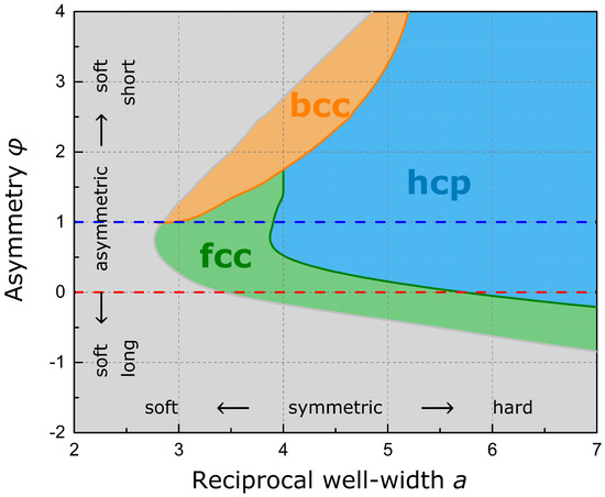 Figure 6). A soft short-range interaction is thus beneficial for these two bcc shells. In addition, a hard long-range interaction neglects higher shells, which would favor the consecutive fcc and hcp second and third shells, whereas the third bcc shell is distant and in many way less stabilizing in comparison. A soft long- and short-range interaction and a generally broad well favor fcc, which occurs in particular within the copper and zinc group as well as the noble metals, whereas a symmetric potential with hard interactions favors hcp. Thus, the form of the pair potential, in particular the asymmetric shape of the minimum, favors one or the other structure motif or lattice symmetry, whereas energy partitioning enforced by the strict geometric structural framework governs the equilibrium cell parameters. Considering the close-packed phases, more sophisticated stacking configurations might present additional equilibrium regions which are not captured by the presented phase diagram, in particular in between hcp and fcc. This may comprise stacking sequences like dhcp as well as ordered stacking-faults.