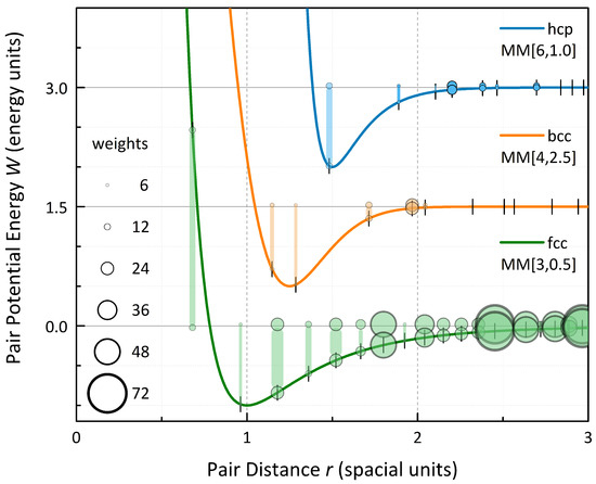 22], both types are mid-ranged pair potentials that predominantly favor icosahedral structures with few exceptions of decahedral or face-centered cubic symmetry for certain “magic” numbers. Generalizing this conclusion for increasing cluster size towards the limit of a 3D periodic crystal, the icosahedral symmetry cannot prevail and in the case of large clusters, the face-centered cubic symmetry would present the only stable structure solution for these potentials (—although for the infinite crystal we find in addition a significant parameter range for hcp symmetry, see Figure 5). In contrast, with the separation of short- and long-range interaction, the Modified Morse Potential offers the freedom to find new stable structures. For clusters up to a size of 210 atoms, this increase of stable structures has been demonstrated for two examples [
