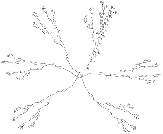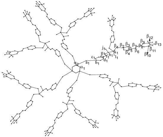 Let the molecular graph of this dendrimer be , where the generation stage of is represented by n. The first and second generations are shown in Figure 1 and Figure 2 respectively.