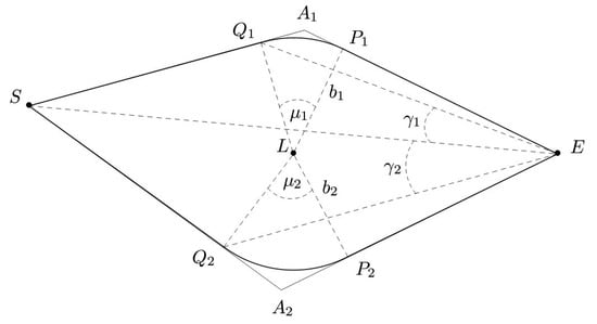 According to assumption 1, we chose and as the points which divide the photons trajectory : from S to and from to E photons are in the region where , and so they run along straight lines (thanks to assumption 3); from to , instead, photons are in the region where , and so they moves on a curved trajectory, which we choose to describe with the arc of a circle in Figure 1.