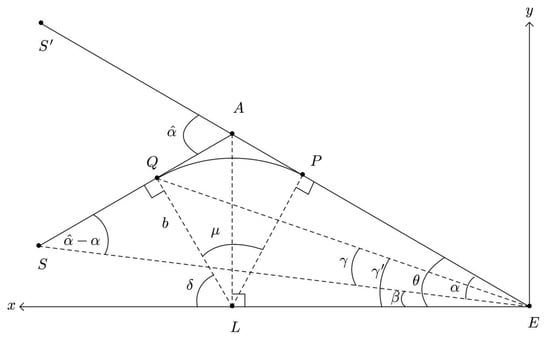 S = source. L = lens. E = observer. = impact parameters. = approximated paths of the photons from S to E, indexed by .