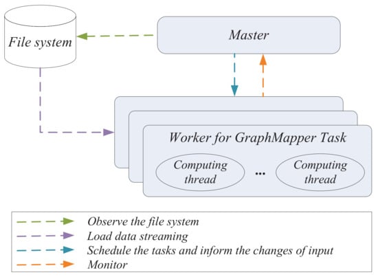 Due to the synchronization phase of each superstep, which ensures the consistent results of each iteration on the previous snapshot in BSP-based graph systems, the GraphTau [] framework is implemented by extending Giraph [], a graph processing system appearing as an open-source implementation of Pregel, to load graph streams in a timely manner and support the incremental computing model on time-evolving graphs. Figure 1 below illustrates the framework of this incremental computing system for time-evolving graphs. It follows the master-worker pattern and supports the BSP-based programming paradigm to better facilitate parallel processingfor various graph algorithms in distributed environments, such as Giraph. It extends Giraph to support the incremental computing model by implementing a specific class of , which inherits the abstract class of . The abstract class of is provided by Giraph for users to specify the responsibility of the master. The class implements the function of , which will be invoked to have the master observing the changes on the input graph after each superstep. If new vertices and edges arrive, the computing nodes will be informed at the beginning of the next superstep to load the new graph stream to construct a new snapshot and to broadcast the current results of the computation on the previous snapshot. Each participating computing node subsequently proceeds with executing the underlying algorithm on the newly-constructed snapshot on the basis of the current results of the previous snapshot.