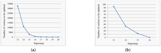 The number of vertices to be updated in single-source shortest path (SSSP). (a) With the global computing model. (b) With the local computing model.