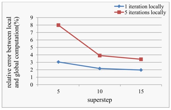 We also take the PageRank algorithm on a sequence of snapshots extracted from Wikipedia [] as an example. The first snapshot during the first five years in the dataset is taken as the input, and the subsequent snapshot during the the next two weeks in the dataset is loaded at a pre-specified superstep of the computation on the first snapshot. As the example of the SSSP algorithm above, we first run the algorithm with the global computing model and then run with the local computing model. We then plot Figure 3 below by computing the relative error between the results with the local computing model and that with the global computing model. Figure 3 illustrates that along with the number of iterations increasing when the new graph stream is inserted, the results with the local computing model get closer to the results with the global computing model. Besides, more iterations executed on local graph structure will lead to a larger relative error between the results with the local computing model and the results with the global computing model as shown in Figure 3.