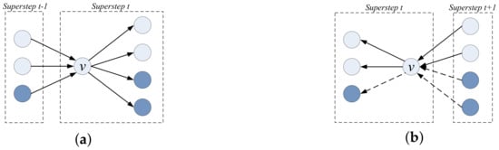 The global computing model is depicted in Figure 5a below, with which message passing could be initiated between both intra- and inter-computing nodes. Typically in the Giraph platform, a vertex v is updated by processing the messages that are received in superstep from its neighbors both located in the same computing node as the vertex v and in other remote computing nodes. Then, the newly-updated value of the vertex is broadcast to its neighbors both located in the same computing nodes and in other remote computing nodes in the current superstep t. Different from the global computing model in distributed environments, message passing could only be initiated in the same computing node with the local computing model. As depicted in Figure 5b below, with the local computing model, a vertex v is updated by processing the iteratively updated values of its local neighbors and the predicted values, which approximate the values of its remote neighbors in the current superstep t. The iteratively updated values of its local neighbors can be read from shared memory, and the predicted values are guessed based on the previous values of its remote neighbors, which had been sent under the global computing model. Specifically, before a new stream arrives, graph computing is executed with the global computing model. When a new stream arrives and graph computing is switched to the local computing model, the approximations will be made actually based on the messages passed under the global computing model. That is, the approximations will be made based on the messages passed before the new stream arrives. Then, under the local computing model, we use the old messages (passed before the new stream arrives) to predict (approximate) the messages that would be transferred when the new snapshot is constructed and executed under the global computing model. For the next superstep t + 1, the local neighbors of the vertex v will pull the value of the vertex v, whereas the remote neighbors of the vertex v will predict the value of the vertex v based on the old value of the vertex v that was sent under the global computing model.