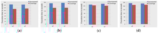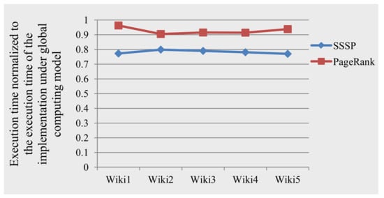 Figure 8 presents the execution time (normalized to the execution time of the implementation under the global computing model) when using the local computing model to conduct the SSSP algorithm and the PageRank algorithm on varying sizes of the Wikipedia graph []. We artificially set the sizes of the graph to be 20%, 40%, 60%, 80% and 100% of the Wikipedia graph. Figure 8 addresses that the runtime performances of the implementations on different scales of the input graphs benefits from using the local computing model.
