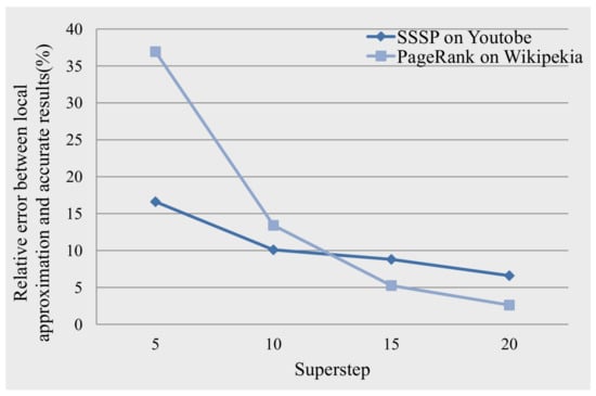 Figure 9 illustrates the relative error between the results with using the local approximation and the final results with using the global computing model in the incremental computing for the SSSP algorithm and the PageRank algorithm when the newly-incoming graph streams are inserted at different supersteps, respectively. Figure 9 presents that the relative errors between the results with the local computing model and the results with the global computing model tend to become smaller along with the new data being inserted at a later superstep for both the graph algorithms. This is because each vertex tends to reach a stable state along with iteratively executing the underlying algorithms on a consistent snapshot.