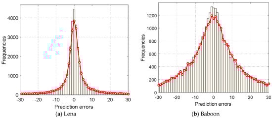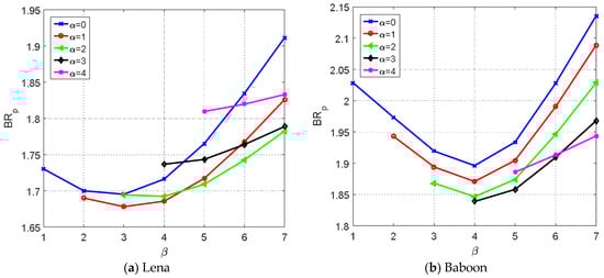 Figure 6a,b shows the pure bitrate, , versus parameter under various for the Lena and Baboon images. As seen from the figures, setting and for the Lena image achieved the lowest bitrate. However, and had to be set for the Baboon image to achieve the best result. This is because the prediction error histogram of the Lena image is sharper than that of the Baboon image, forcing the ACC technique to select smaller and values. In contrast, the prediction error histogram of the Baboon image is flatter than that of the Lena image, and thus larger and are selected.