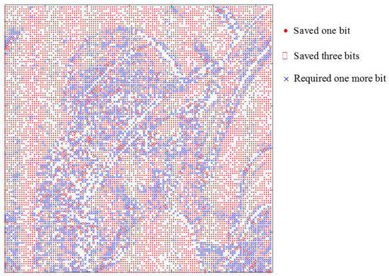 Since all of the prediction errors can be obtained by pre-scanning the transformed means and differences, the bitrate can be pre-estimated prior to the encoding and embedding processes. Therefore, the best parameters, denoted by and , that minimize the bitrate can be simply obtained by varying their values within a small range while pre-estimating the bitrate. According to our experiments, setting and is sufficient to obtain the best values. Figure 3 shows the effect of the proposed ACC technique applied on the Lena image with and . In this figure, the red dots and red circles represent that the proposed method saves and bits when recording the prediction errors, respectively. In contrast, the blue cross marks represents that one more bit is required in the proposed ACC technique to record the prediction errors. As shown in this figure, the number of red dots and circles is significantly more than that of blue cross marks, indicating that the ACC technique indeed effectively reduces the bitrate.