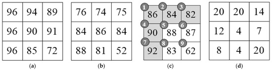 We use a simple example to illustrate the embedding procedures of the proposed method. Suppose the AMBTC codes consist of upper and lower quantization levels, as shown in Figure 4a,b, respectively. Let = ‘10111001’ be the secret data and suppose , . Firstly, we convert the quantization levels into means, , and differences, , using Equation (2). The converted results are shown in Figure 4c,d.