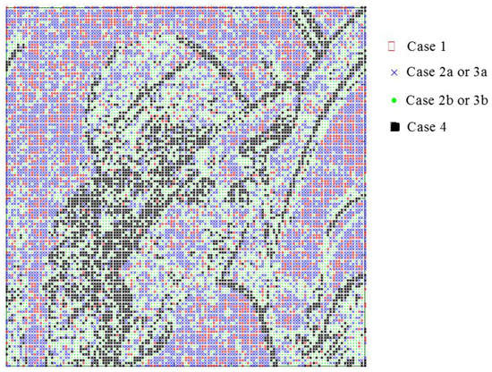 The proposed method classifies prediction errors into four encoding cases, and each case requires a different number of bits to record the prediction error. Figure 7 shows the distributions of these cases when the ACC technique is applied on the transformed means with and . In this figure, the red circles, blue crosses, green dots, and black squares representing the corresponding means are encoded using case 1, 2a or 3a, 2b or 3b, and 4, respectively.