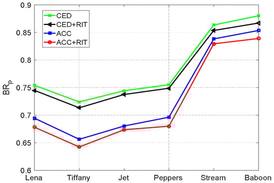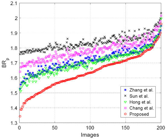 Since the pure bitrate of a smooth image is lower than that of a complex one, we can surmise that the images on the left-hand side are smoother than the right-hand side images. As seen from Figure 9, the reduction in pure bitrate was more significant for smooth images than complex ones. Nevertheless, the proposed method offered the lowest pure bitrate for all of the 200 test images, indicating that the proposed RIT and ACC techniques are indeed more efficient than other state-of-the-art works.
