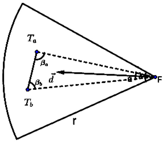 At the beginning of each event, the central server assigns the information of the target to the public. Given any target segment , a set of photos, each of which is uploaded to the server with data-unit. The data-unit of a photo is defined as (as shown is Figure 1), in which vector is emitted from the aperture of the camera perpendicular to the plane of the image, indicating the direction of the camera when taking photos. denotes the field of view of the camera lens, is the camera’s effective range of shooting, beyond which the target is difficult to identify in the photos. The position of the camera is p. The triangular angle between the camera and the target segment is defined as . is the size of an arbitrary edge angle of the triangle formed by a camera and the target segment. The acquisition of and requires the calculation of a certain formula. The acquisition of the data-unit is described in the fifth-part.