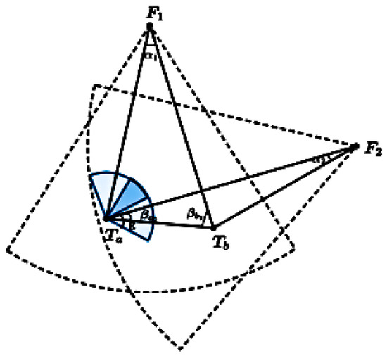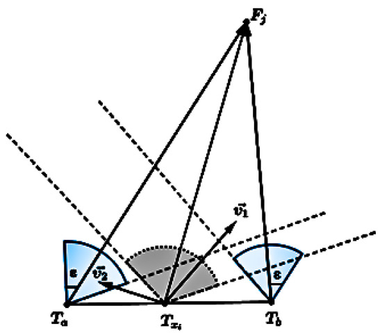 This paper defines the area of the target to cover the predefined section of the area as much as possible. As shown in Figure 2, the endpoints of the target segment , has a predefined angle, called an effective angle (called effective angle). In addition, each of which form an effective angle interval 2 (blue shadows) [12]. It is the direction of the camera toward the end point of the region when photographing. is the direction of the camera toward the endpoint of the segment. is the direction of the camera toward the endpoint of the segment.