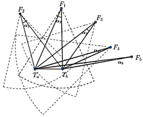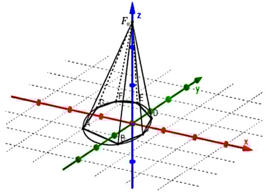 For a closed curve area of the entire target area , points can be found to convert the target polygon area , the number of n depends on the actual situation of the convex closed curve. The larger n is, the smaller the error is, and the greater the computational complexity is. In this way, the n-polygon has n sides, and each side can be regarded as a target segment. From a camera perspective, F can be located anywhere in Z space. Its actual coverage is shown in Figure 6.