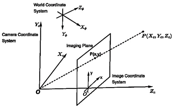In a certain environment, the world coordinate system [28,29] is commonly used to describe the position of the camera and the object. The relationship between the camera coordinate system and the world coordinate system can be described by a rotation matrix and a translation vector. Thus, the homogeneous coordinates of a point in the world coordinate system and the camera coordinate system are respectively sum and exist as follows: