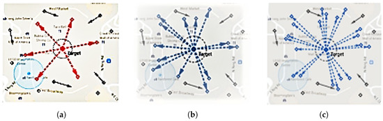 The minimum selection algorithm selects six photos to meet the coverage requirements as shown in Figure 12a. The angle between any two adjacent observation directions (connecting the camera and the dotted line of the target) is less than 80 degrees. Because the effective angle is set to 40 degrees. Compared with the minimum selection algorithm, as shown in Figure 12b, the location-based random selection algorithm1 selects the photos one by one randomly until the coverage is achieved. It selects at least 13 photos to meet the same coverage requirements as shown in Figure 12b. The random selection algorithm 2 selects the number of photos as 20, as shown in Figure 12c. The experiment is repeated 100 times, and an average of 25 photographs can be selected each time to satisfy the same coverage requirements.