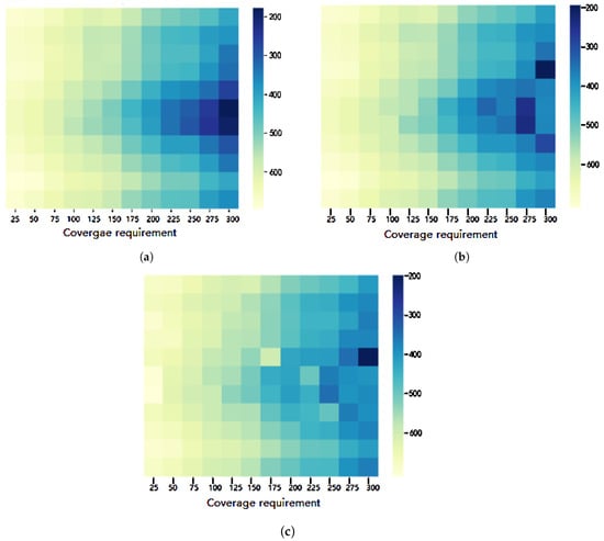 As further illustrated in Figure 13, in the case where the number of candidate photos is increased by 144, a 12 × 12 matrix is formed, and how the three algorithms cover the target area in the same coverage requirements interval. For convenience, the darker the color, the fewer photos are selected. It can be clearly seen from figures that under a certain coverage requirement, the number of photos selected by the minimum selection algorithm (Figure 13a) is the smallest, followed by the random Algorithm 1 (Figure 13b), and the number of photos selected by the random Algorithm 2 (Figure 13c) is the largest. The above proves the practical effectiveness of the minimum selection algorithm in this paper.