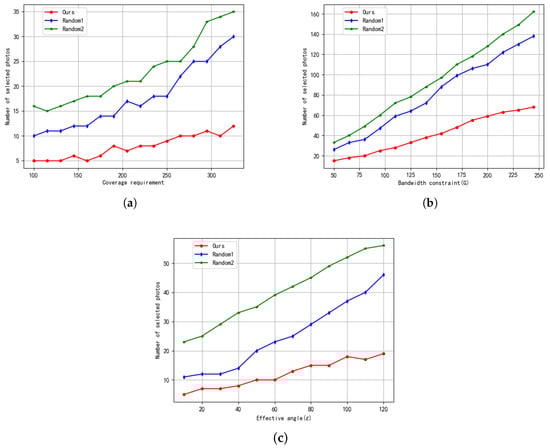 Figure 14 shows the comparison of the effectiveness of the three selection algorithms by changing three parameters: coverage requirement, bandwidth limitation, and effective angle. Figure 14a shows that when the bandwidth M and the effective angle , it can be clearly seen that the number of photos selected by the random algorithm is higher than the minimum selection algorithm when initially selected. With the increase of coverage requirements, the number of photos selected by the minimum selection algorithm is growing slowly and is lower than the other two algorithms.