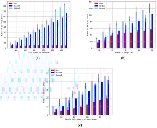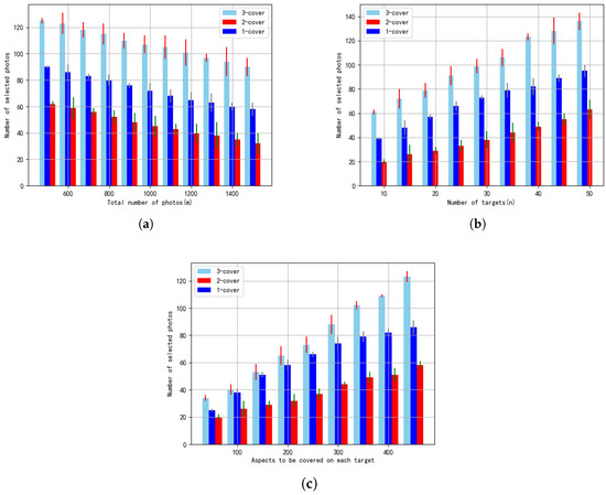 In Figure 16b, the number of targets is changed from 5 to 50 while the total number of photos is fixed at 1000. For the target, all angles from to should meet the coverage requirement level. The relationship between the bar charts is similar to the transformation in Figure 15a, and the trend is similar to that in Figure 15b. In Figure 16c, the total number of targets is remaining constant, then it changes the number of coverage aspect requirements. The relationship between the bar transforms is similar to Figure 16a,b, and the increasing trend of bar charts is similar to that in Figure 15c.