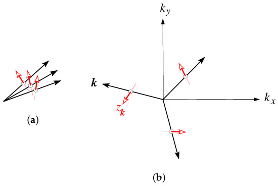 Visualization of the space magnetism in a narrow, roughly half-filled superconducting band: the black arrows show the vectors of Bloch electrons moving in general positions at the Fermi level, and the red arrows indicate the symmetry axis of the spin of the Bloch electron with wave vector . The axes generally intersect the drawing plane. Panel (a) demonstrates that the axes change continuously in space; and Panel (b) shows the vectors of three Bloch electrons connected by symmetry (in a crystal with the hexagonal space group P3) and demonstrates that also the axes are connected by symmetry.