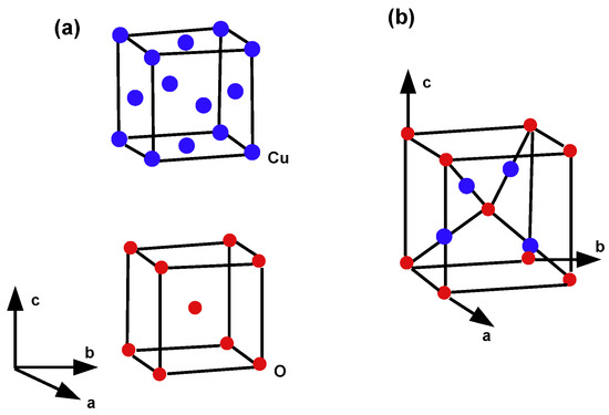 Crystallographic structure of the molecule . (a) Structural characteristics of and O atoms in the lattice. The lattice is formed by interpenetrating the and O lattices with each other. (b) Unit cell of . Copper atoms are shown as small blue spheres, and oxygen atoms are shown as large red spheres. In the lattice, each atom is coordinated with two O atoms, and each O atom is coordinated with four atoms.