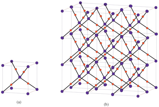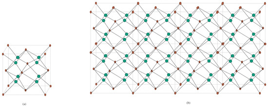 Among various transition metal oxides, has attracted much attention in recent years owing to its distinguished properties and non-toxic nature, low-cost, abundance and simple fabrication process [27]. Nowadays, the promising applications of mainly focus on chemical sensors, solar cells, photocatalysis, lithium-ion batteries and catalysis [28]. The chemical graph of the crystallographic structure of is described in Figure 1 and Figure 2; see details in [29]. Let be the chemical graph of with unit cells in the plane and t layers. We construct this graph first by taking units in the -plane and then storing it up in t layers. The number of vertices and edges of is and , respectively. In , the number of vertices of degree zero is four; the number of vertices of degree one is ; the number of vertices of degree two is ; and the number of vertices of degree four is . Furthermore, the edge partition of based on the degrees of end vertices of each edge is depicted in Table 1.