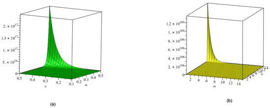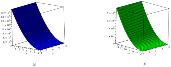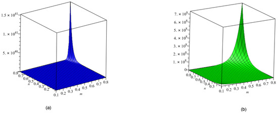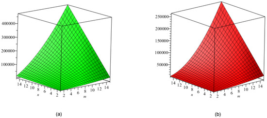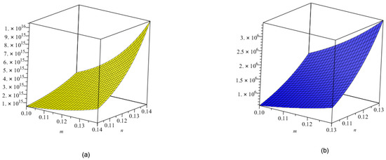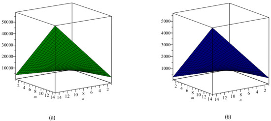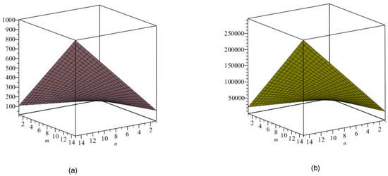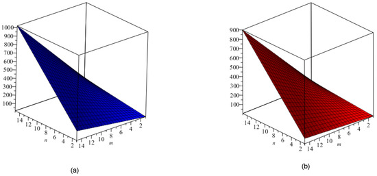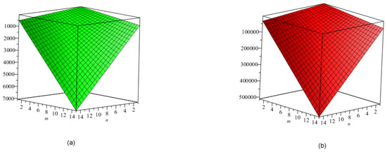 Since the topological indices have many applications in different branches of science, namely pharmaceutical, chemistry and biological drugs, the graphical representation of these calculated results is helpful to scientists. The graphical representations of topological indices for are depicted for Randić indices in Figure 4 and Figure 5. The atomic bond connectivity index and geometric arithmetic index for are depicted in Figure 6. The first and second Zagreb indices for are depicted in Figure 7. The fourth atomic bond connectivity index and the fifth geometric arithmetic index for are depicted in Figure 8.