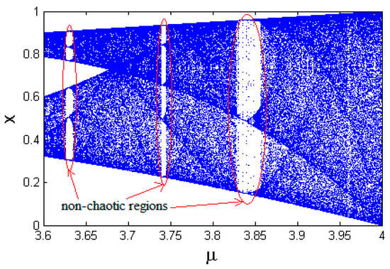 Bifurcation of logistic map in (1) for μ [3.6, 4].