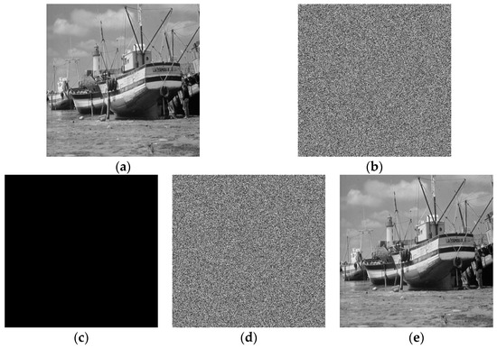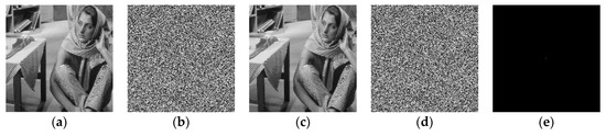 Simulation of lack of plain-image sensitivity: (a) plain image I1; (b) encrypted image E1 of I1; (c) plain image I2; (d) encrypted image E2 of I2; (e) difference of two encrypted images E1 and E2.