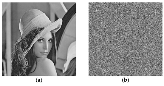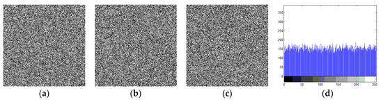 As discussed earlier in Section 3.3, the Wang et al. algorithm [14] has a lack of plain-image sensitivity which is justified by their respective experimental scores provided in two Tables. We also performed the simulation analysis for plain-image sensitivity of the improved scheme similar to the one undertaken in Section 3.3. Therefore, we executed the improved scheme for two plain images shown in Figure 2a,c, differing by just one pixel, and as a result the encrypted images shown in Figure 7a,b are obtained. The difference between these two encrypted images is evaluated and shown as an image in Figure 7c. As we can observe, the difference image is like a random image in which pixels are uniformly distributed as in the case of any other encrypted image, see Figure 7d, which confirms the existence of excellent sensitivity of the improved scheme to a change in pending plain images.