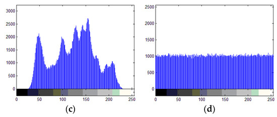 Histogram analysis refers to the study of distribution of pixel intensities of the image, where a pixel can have any of the 256 intensity levels. The histogram reveals the nature of distribution of image pixels i.e., whether the distribution is either uniform or non-uniform. For a strong image encryption algorithm, the histogram of a plain image and encrypted image must have considerable differences. It is desired that the histogram of the encrypted image should be as uniform in nature as possible in order to prohibit the attacker from gaining any information of the plain image or key from a non-uniform histogram of the encrypted image [35]. For gray images, the histograms of plain and encrypted images are available in Figure 5a,b. For color images, the histograms are provided in Figure 6c–h. We can notice that these histograms for encrypted images are almost flat and uniform like the distribution of some noise data, completely different from the histograms of plain images; hence, the improved scheme is able to eradicate the chance of leaking any information to an attacker through histogram-based statistical attacks.