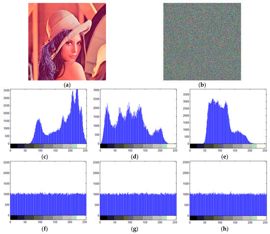 Encryption results for Lena color plain image: (a) color plain image; (b) encrypted color image; (c) histogram of plain R component; (d) histogram of plain G component; (e) histogram of plain B component; (f) histogram of encrypted R component; (g) histogram of encrypted G component; (h) histogram of encrypted B component.
