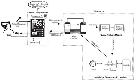 The proposed architecture is a Speech Interface that can make queries and obtain responses by voice, linked to a platform designed with the semantic web tools, OWL, SPARQL, ontologies, etc. At a hardware scale, both the Raspberry Pi and Web Server are used. In others, on an abstract level, there are four blocks that can be distinguished: text-to-speech (TTS) and speech-to-text (STT) converter, Web interface, the Query Analysis Module, and the Knowledge Representation Module. In the implementation of the architecture, we use the tools of cloud computing. In our case, we use the layer called Platform-as-a-Service (PaaS) that provides the user with an ability to expand their applications in the cloud by programming both language and software tools (for example: Java, Phyton, and the Google App). Figure 2 shows the proposed architecture.