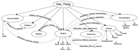In our work, we have chosen the tourism sector as the domain of ontology because, in our country, it is a sector of considerable growth. Travel involves multiple needs such as: lodging, food, transport, etc. Then, a tourist should know the various sources of information related to tourism. As observed in Figure 3, our ontological model defines the main classes as Transportation, Category, Gastronomy, Destiny, Weather, Interest and Accommodation. Then, the subclasses, instances, relations and properties of our ontological model are defined, and the authors check the consistency of the ontology with tools of the Protegé editor. Our designed ontology contains seven classes, 16 subclasses, 573 instances, 15 object type properties and 13 data type properties. Finally, we have obtained an OWL ontology that contains all the tourist information applied in a special case in Peru that will be used by the system.