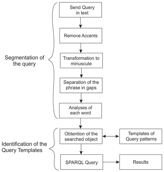 An important part of the experiment is to identify the query template use because of this being where the Natural Language query is done. In many cases, it is impossible for the final user to understand the complex schemes of the Semantic Web in order to express a valid query in SPARQL language. In addition, the user needs to know the ontological model in order to make queries. There are works around the world that are trying to transform a query from Natural Language into SPARQL query language, identifying the subject, predicate, and object in the sentences of the respective query. In our paper, a variation has been done. An object or variable of the query made by the user has been identified, from comparison criteria of the user’s query with the pre-established templates, without many complications in the usage of SPARQL, by using only one variable in the query. This is because the SPARQL query language has the possibility of placing a variable instead of an RDF term in the subject, predicate or object’s position. In the designed template, there is only one variable that allows for making the coincidence with the voice query, and this variable is generally an instance of the ontology. There are two internal processes that are detailed as follows and shown in Figure 5.