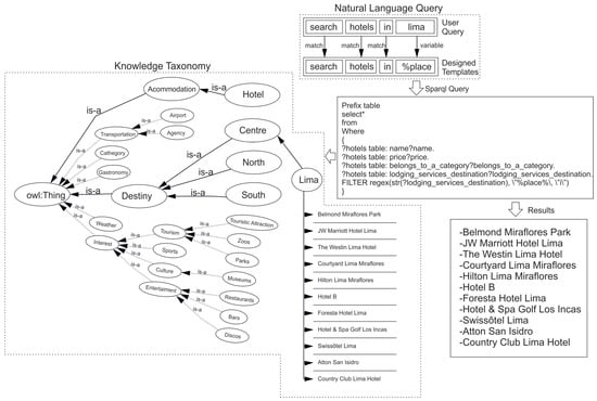 For instance, in searching for hotels in the Department of Lima, a voice query “Find hotels in Lima” is made (transformed into text string). Then, it will be compared with the sentence defined in Natural Language (NL) “Find hotels in %Place”, where %Place is the variable or object that the system recognizes and it will be associated with the SPARQL query template to use. In our work, the system will be comparing word by word and finally it will find something that it does not recognize and this will be the variable in which a determined value must be assigned. When the system obtains the already defined object as “Lima”, it will send it to the Knowledge Representation Module where the SPARQL query is completed through the Jena Library.