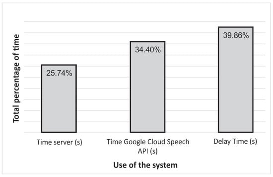 As seen in Table 2, many response times of the system have been obtained, by making a program developed in Python language that calculates the time. In each case, it is seen that answers are too limited. First and foremost, the time response of the web server is a lapse of time between the Raspberry Pi sening a HTTP request and the web server sending a HTTP response with a JSON object. Secondly, the time response of the Google Cloud Speech API is the time limit spent in Speech-to-Text conversion. Third, time response is Delay Time of the system. This delay includes the process of transformation from voice to text and possible errors before the inquiry. To avoid these errors, we must perform an initial small training of system. To start the trainee system, we carry out the following question: “Hello Samanta”, and the system responds “Hello, what do you want?”. From there, we can make queries in natural language, and then the system will start with the transformation into a SPARQL query. As we see in Figure 6, the system spends more time in the delay. All of the times were verified using tests’ statistics to analyze whether the data used come from a normal distribution. The time that is selected as an indicator in the speech interface is the total time of making the whole operation in the system and this can be used to make future comparisons with other querying interfaces. These experiments were done by the working group.