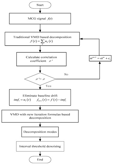 In order to overcome the problems above, we propose an improved VMD method that determines the bandwidth of modes adaptively via the optimized quadratic penalty. The proposed correlation coefficient, between the IMF obtained by VMD [19,23] and the baseline drift model, is calculated repeatedly until the criterion is satisfied and the baseline drift noise is extracted. The new IMFs are then obtained by using new proposed update formulas that can be deduced by the relationship between the penalty factor and noise. The interval threshold method is used for the subsequent processing of each component, which removes noise components.