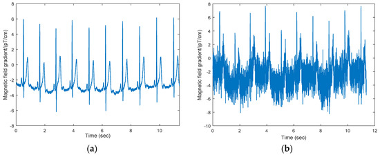 In recent years, the research on signal processing, modeling, imaging theory, and methods related to bio-electromagnetism has become a hot topic. With the efforts of many experts and scholars, this field already has high-level research results. The magnetocardiography [1] signal plays an increasingly important role in heart disease diagnosis, which is detected with Superconducting Quantum Interference Devices (SQUID) [2] and has considerable advantages over electrocardiography (ECG) [3]. As the detecting instrument of the magnetocardiography signal, the SQUID operates from low to high temperature, and changes the number of channels from the original single channel into multiple channels. Magnetocardiography signals transmitted to the human chest surface are incredibly helpful toward both cardiac model reconstruction and clinical application [4,5]. The relationship between heart function and heart disease is studied by researching the characteristics of magnetic field strength changes at different locations; this type of study can be called interdisciplinary basic research. Generally, such measurements are conducted in order to detect small magnetic field signals in the presence of large background noise [6,7]. Removing background noise and recovering useful signals are chief objectives. For periodic signals, adequate suppression of uncorrelated noise may often be achieved by the signal averaging method [8]. If the signal and noise have separate bandwidths, one can use conventional frequency domain filtering [9] techniques. Adaptive filtering techniques [10] measure the noise level of the measurement signal channels by measuring the noise channels. However, these simple preprocessing methods have limited effectiveness. The wavelet transform method [11] for signal denoising is based on the use of a set of predefined basis functions, in order to decompose the measured signals and remove components corresponding to noise. The main disadvantage of this method is that the selection of wavelet basis seriously affects the denoising results. Empirical Mode Decomposition (EMD) [12,13] is one of the decomposition methods of signal denoising, and is widely used to decompose a signal into different modes recursively. This method is, however, prone to mode mixing, and limited by sensitivity to noise and sampling [14]. The mode mixing is significantly reduced by a modified noise-assisted data analysis method known as the Ensemble Empirical Mode Decomposition (EEMD) method [14,15]. The denoising principle of magnetocardiography (MCG) signals by EEMD based methods was reported in [16,17]. However, the decomposition results were unsatisfactory because of the low signal-to-noise ratio. In addition, the decomposition results of EMD and EEMD heavily depend on the extremum seeking algorithm and the ending criterion. A lack of mathematical approach and predefined filter boundaries reduce the accuracies of such detections [18]. Lately, based on the definition of intrinsic mode functions (IMF), a new adaptive decomposition method called Variational Mode Decomposition (VMD) [19] has been proposed. Supporting documents [20] proposed using the VMD method to denoise ECG signals. However, the research results showed that the decomposition results lack adaptability. The results of studies [21,22] showed that baseline drift noise was not filtered out by the VMD method. In practice, it is not always possible to have the first IMF to be a noise-only IMF.