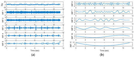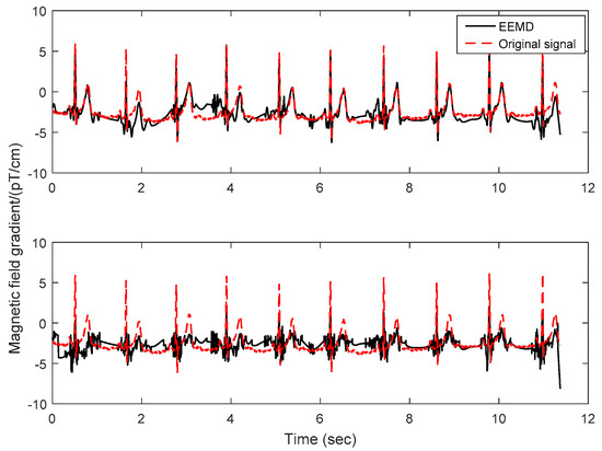 The signal is denoised by different algorithms. In Figure 3a,b, we show the signal decomposition results obtained by the EEMD method. In Figure 3, according to the length of the data, the MCG signal is decomposed into ten IMFs, and the frequency of IMFs reduces as the order increases. In general, the low frequency smooth variation of the baseline is expected to be contained in the residue of the higher order IMFs. However, we cannot determine the low-frequency component that contains baseline drift noise. It is evident that we can extract signal characteristics from IMF2 to IMF6. Unfortunately, other IMFs may also contain useful signal components that are invisible to the human eye. Given this, we apply thresholds only to a few low order IMFs that contain contributions from the high frequency noise components, then exclude a few high order IMFs that contain the low frequency contents with a view, to ensure that the low frequency contents of the MCG signal are not affected or distorted by thresholding.