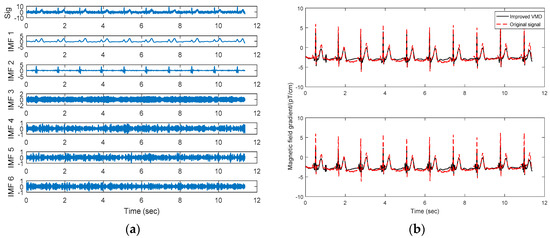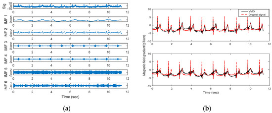 Based on the bandwidth of the measurement signal and multiple tests, the number of modes decomposed by VMD is assigned to 6. The original algorithm proposer studied some of the convergence characteristics of the VMD algorithm and its sensitivity to the initial conditions, then got relatively suitable initialization parameters. The initial value of quadratic penalty is assigned to 2000, and the default of the bandwidth is 0. With this method, the MCG signal is divided into several frequency bands centering on respective center frequency, which benefits subsequent operation. As shown in Figure 5a, the MCG signal is divided into six IMFs. The baseline drift noise is found in IMF1. In Figure 5b, we compare the original signal with the reconstructed signals obtained from VMD methods with soft and hard thresholding. The results show that the baseline of the reconstructed signal is not uniform with the original signal. To make matters worse, there is serious distortion in the reconstructed signal from the soft thresholding processing. It is obvious that the algorithm cannot effectively remove baseline drift noise. The decomposition process of the algorithm lacks of adaptability. Improper decomposition results can easily lead to waveform distortion after threshold processing.