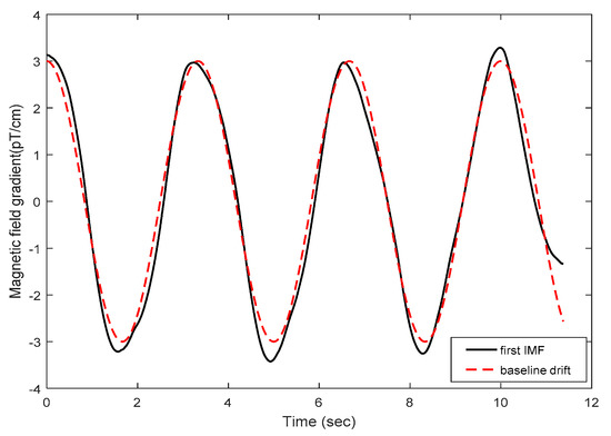 To understand the relationship between the first IMF and baseline drift noise, we propose the correlation coefficient to estimate the relationship. Assuming that the baseline drift noise model is and the correlation coefficient are calculated by Equation (13):