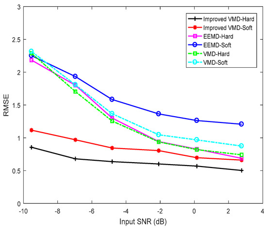 In order to better compare the performance of the algorithms, we use the root-mean-square error (the square root of the mean of the sum of squared residuals, RMSE) to characterize the fitting degree of the reconstructed signal and the original signal. In Figure 8, we compare the root-mean-square deviation (RMSE) of the three methods with the input signal-to-noise ratio (SNR). In the case of low input SNR, the RMSE of the improved VMD method is significantly less than the other two methods, and the method has better denoising performance even with the low input SNR.
